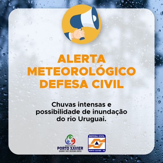 A Defesa Civil Municipal, informa sobre um alerta meteorológico importante entre quarta-feira, 25/10, e sexta-feira, 27/10, que prevê chuvas intensas, com um acumulado de até 250 mm na região do médio Uruguai, que provavelmente voltará a ser afetado pela inundação do rio Uruguai a partir da próxima terça-feira, em se confirmando o evento adverso de chuvas intensas que atingirá a divisa com SC durante o próximo fim de semana.