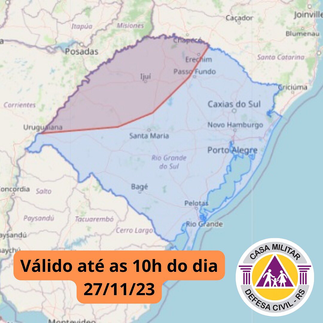 Alerta de chuva pontualmente forte, descargas elétricas, eventual queda de granizo e vento forte. Válido até 10h da segunda-feira. Emergência ligue 190/193.