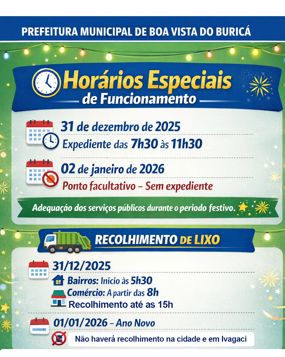 A Administração Municipal de Boa Vista do Buricá publicou decreto que estabelece horários especiais de funcionamento nas repartições públicas municipais em razão das festividades de Ano Novo.