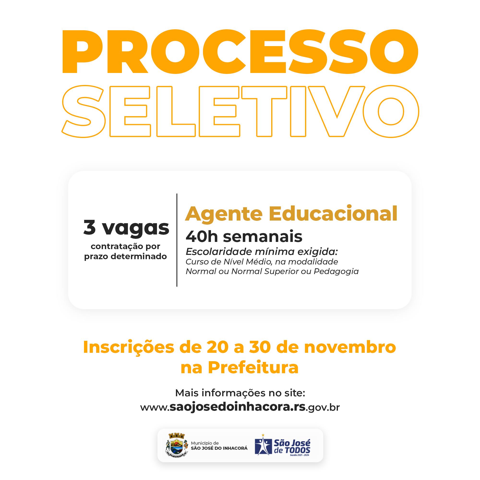 Estão abertas as inscrições, no período de 20 a 30 de novembro de 2023, para 3 vagas de Agente Educacional — 40h semanais.