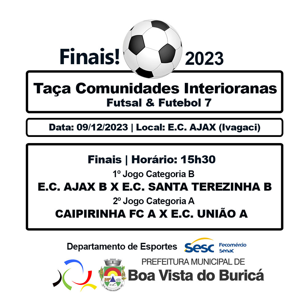 As finais da Taça Comunidades Interioranas de Futsal e Futebol 7 serão realizadas neste sábado 09/12/2023, em Ivagaci no campo do Esporte Clube AJAX, a partir das 15h30, com os seguintes jogos: