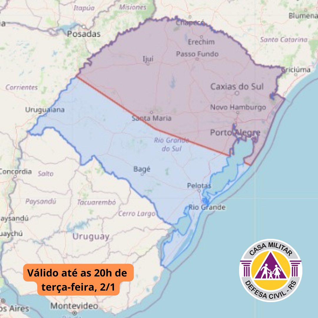 Alerta da Defesa Civil para chuvas e ventos pontualmente fortes, descargas elétricas e queda de granizo pequeno. Válido até 20h de terça-feira, 2 de janeiro. Em caso de emergência, ligue 190/193.