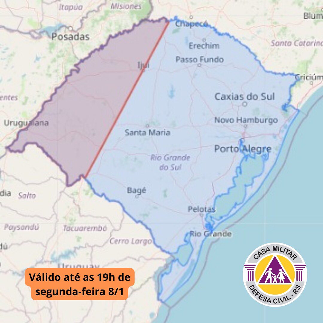 Alerta de chuvas e ventos fortes, descargas elétricas e eventual queda de granizo. Válido até as 19h de segunda-feira. Emergência ligue 190/193.