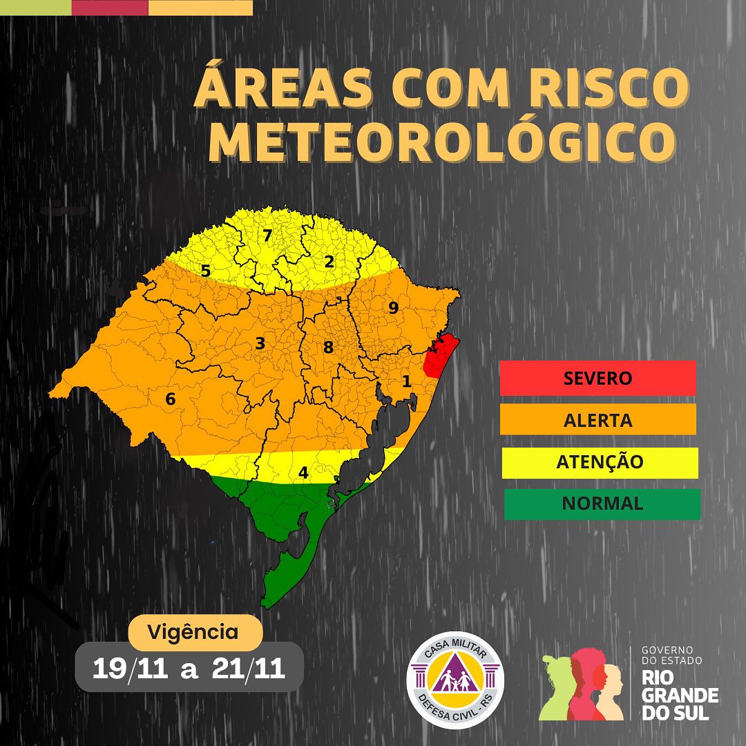 Na terça (19), uma frente fria estacionária aliada a um sistema de baixa pressão sobre o Paraguai, e ao transporte de umidade vinda do Oceano, contribuem na ocorrência de chuvas fortes e temporais isolados, especialmente no Oeste, Centro, parte da Campanha e na metade Norte. Os acumulados variam entre 70 e 90 mm/dia no Oeste,Missões e parte do Centro. No Litoral Norte, os volumes ficam em torno de 60 mm/dia, e abaixo de 40 mm/dia nas demais regiões. As rajadas de vento ficam entre 40 e 60 km/h nas áreas com instabilidades.
