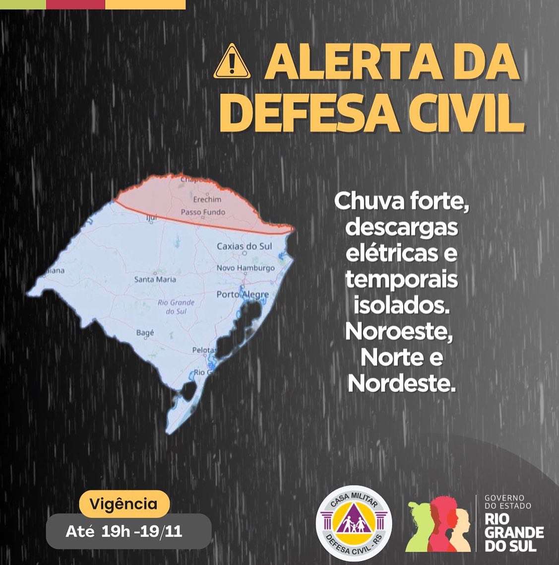 Defesa Civil alerta para chuva forte, descargas elétricas e temporais isolados. Emergência ligue 190 ou 193.