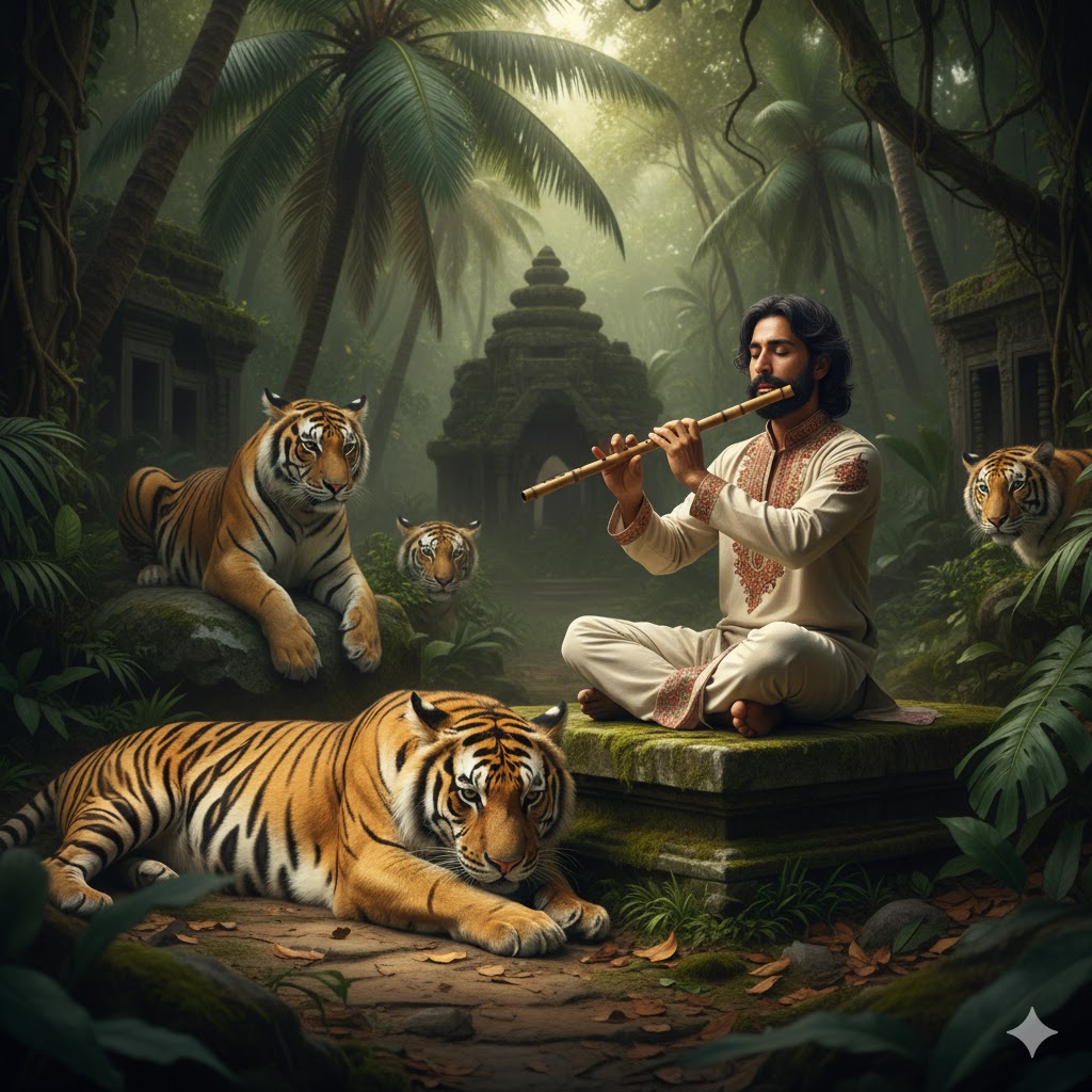 Porém um dia o show não aconteceu; o encantador foi à floresta, mas não voltou. Procura daqui, procura dali, e encontraram um tigre dormindo ao lado de ossos, pedaços de roupas e a flauta do mágico. Intrigados com o inesperado acontecimento, estudiosos capturaram o tigre para entender por que havia reagido diferente de todos os outros animais. A conclusão foi simples e indubitável: o bicho era surdo. Não ouviu o toque da flauta, por isso atacou o homem pelas costas e o devorou.