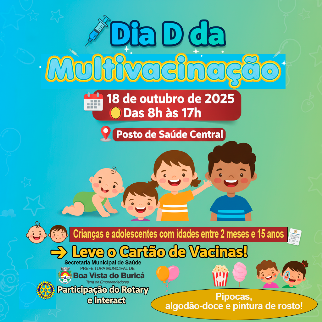 A Secretaria Municipal de Saúde de Boa Vista do Buricá promove no próximo sábado, 18 de outubro de 2025, o Dia D da Multivacinação, que acontecerá no Posto de Saúde Central, das 8h às 17h.