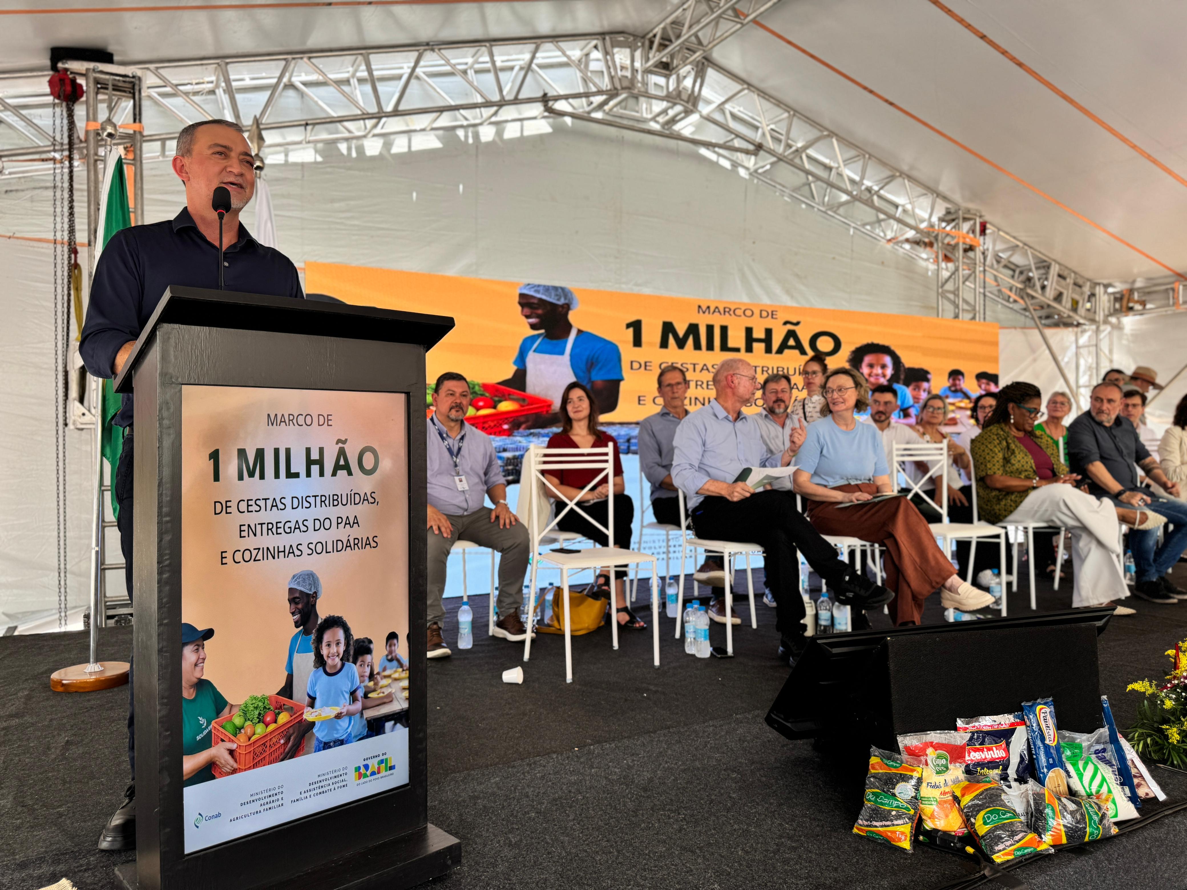 Em ato simbólico durante o evento, a milionésima cesta foi entregue a representantes do público prioritário da ação governamental, com o objetivo de assegurar o direito constitucional à alimentação. Na mesma ocasião, um caminhão da Companhia foi carregado com 560 cestas, o equivalente a 12,3 toneladas de alimentos, que serão enviadas à coordenação regional da Fundação Nacional dos Povos Indígenas (Funai) de Passo Fundo.