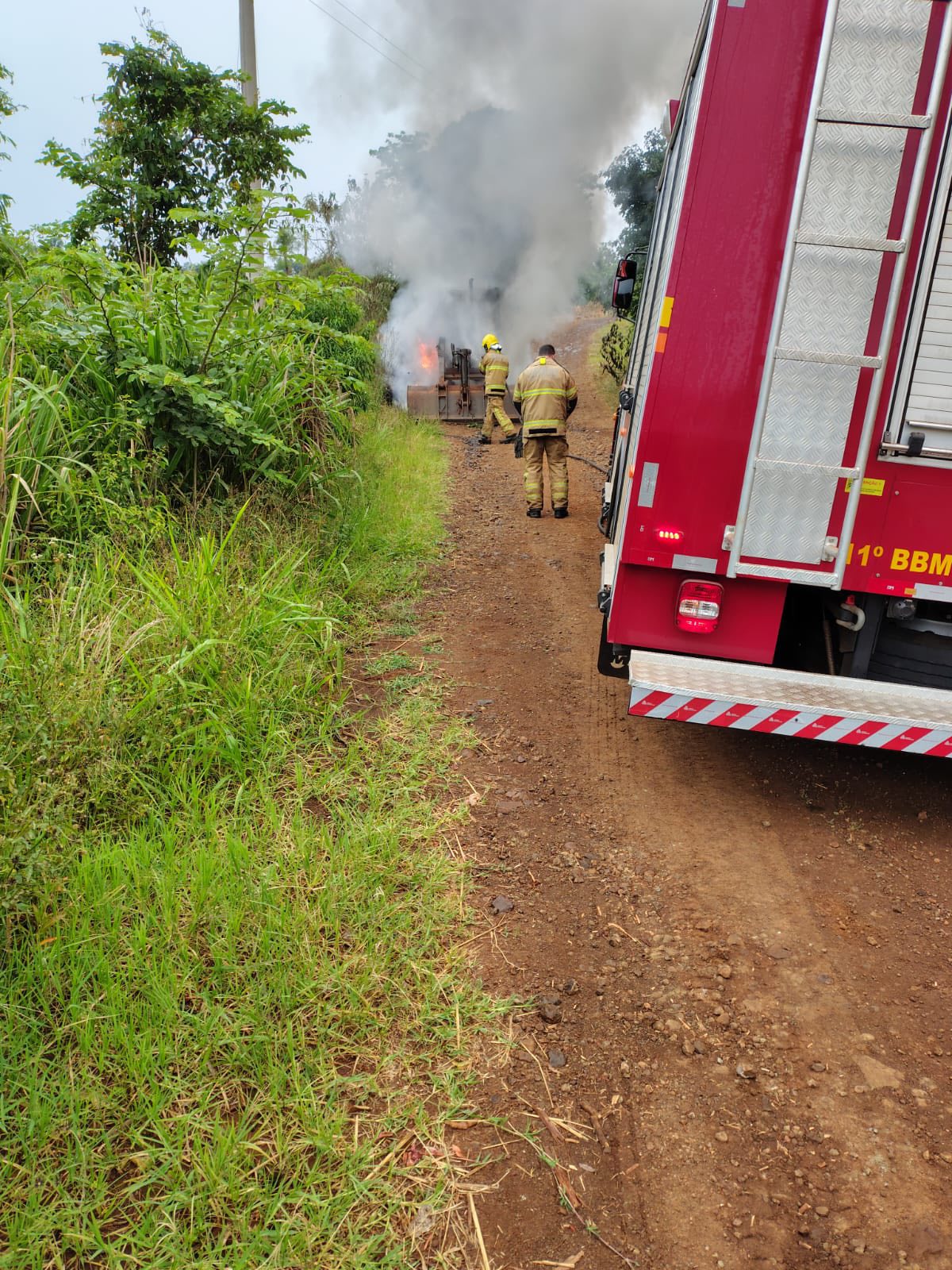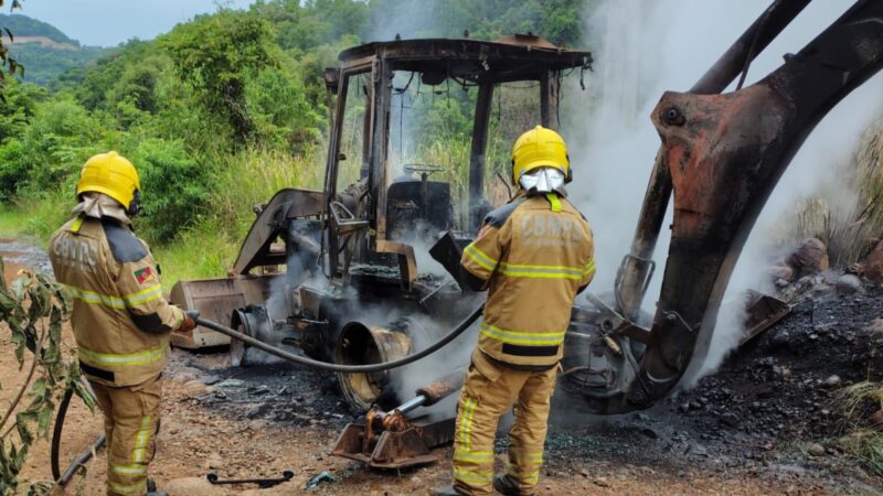 Retroescavadeira da Prefeitura pega fogo durante serviço no interior