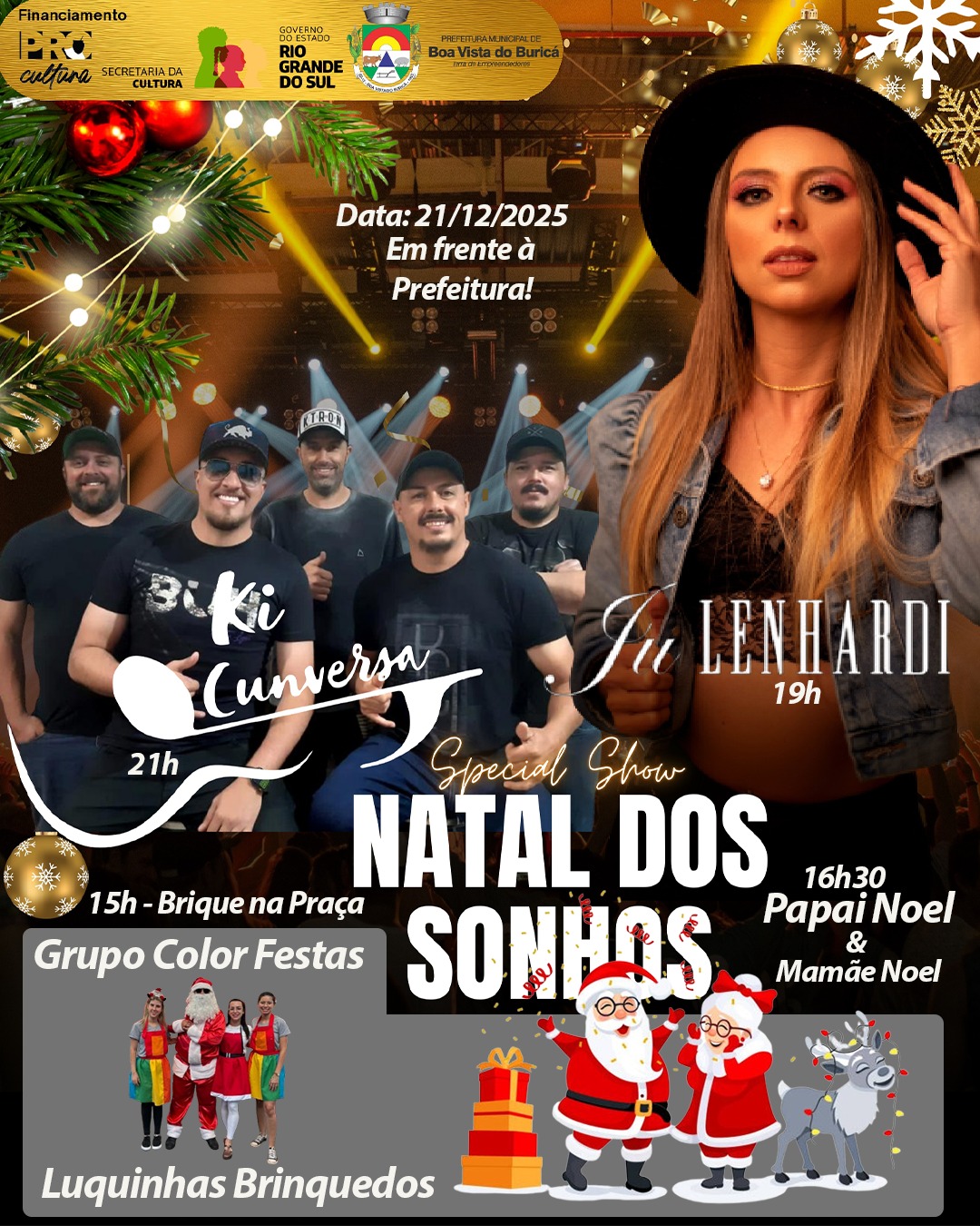 O município de Boa Vista do Buricá promove, neste domingo, dia 21 de dezembro de 2025, o evento Natal dos Sonhos, com uma programação especial voltada a toda a comunidade. As atividades terão início a partir das 15h, na praça central, em frente à Prefeitura Municipal.