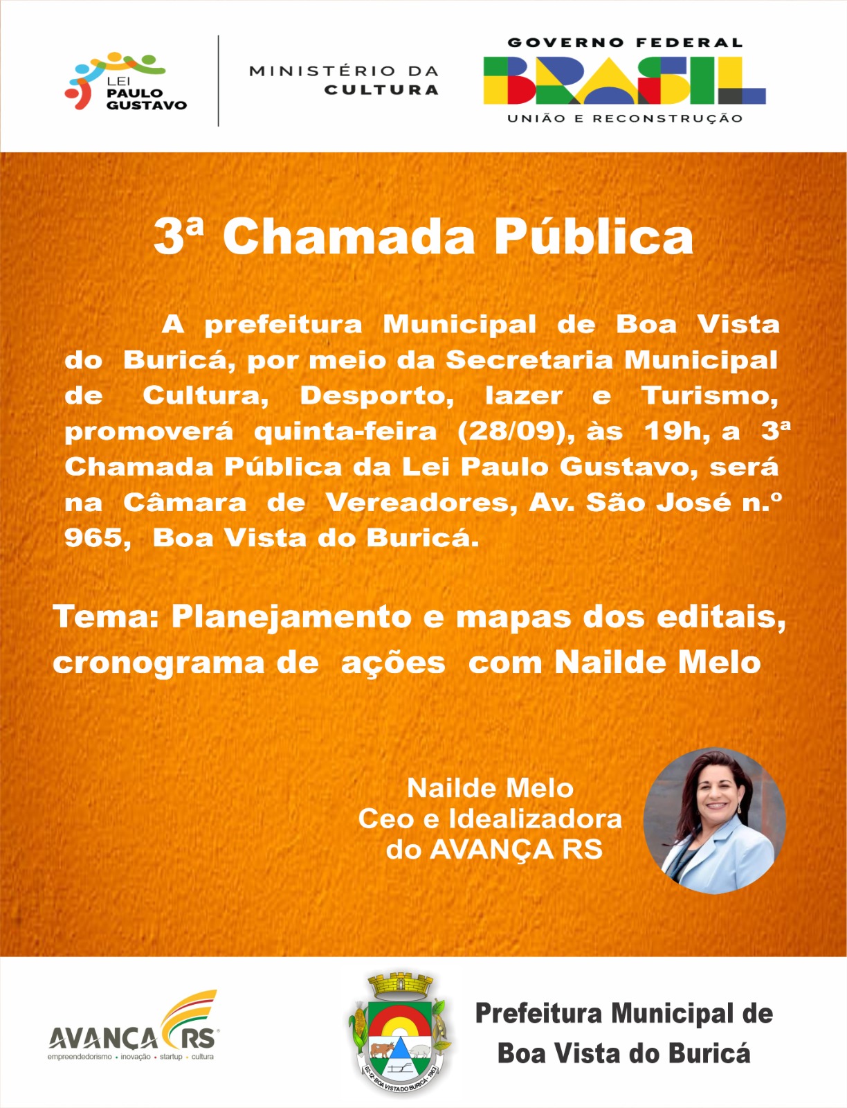 A Prefeitura Municipal de Boa Vista de Buricá, por meio da Secretaria de Cultura, Desporto, Lazer e Turismo, promoverá na quinta-feira (28/09/2023), às 19h, a 2ª Chamada Pública da Lei Paulo Gustavo, será no Plenário da Câmara de Vereadores na Av. São José 965, Boa Vista do Buricá.