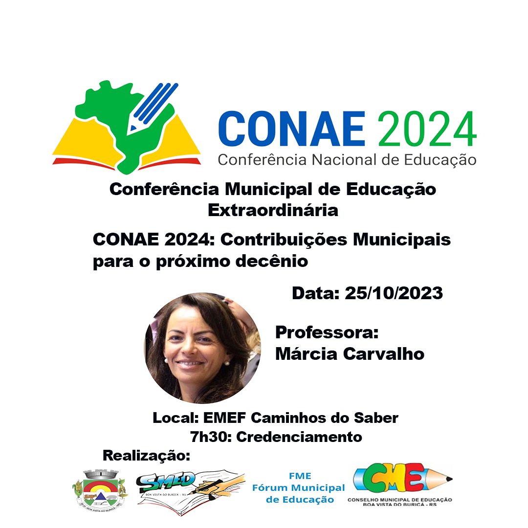 A Administração Municipal de Boa Vista do Buricá, através da Secretaria Municipal de Educação – SMED, realiza dia 25 de outubro de 2023, próxima quarta-feira, a Conferência Municipal de Educação Extraordinária, a partir das 7h30 minutos, na EMEF Caminhos do Saber, com a seguinte programação: