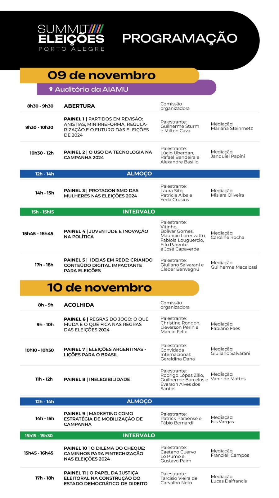 O Summit Eleições Porto Alegre terá 11 painéis, com temas que incluem as regras para as próximas eleições, o protagonismo das mulheres e a juventude na política, o papel da Justiça Eleitoral na democracia brasileira, inelegibilidades, minirreforma eleitoral, anistias e regularização partidária, além de marketing e criação de conteúdo para as eleições.