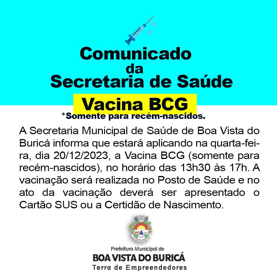Vacina BCG será aplicada em recém-nascidos no dia 20/12 em Boa Vista do Buricá
