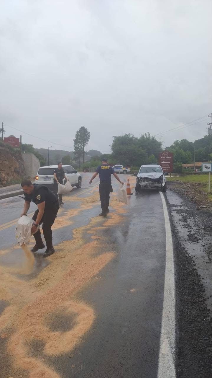 Os ocupantes já foram atendidos pelo Corpo de Bombeiros. Equipes do DMT estão no local, e já foi solicitada a colocação de serragem na pista.